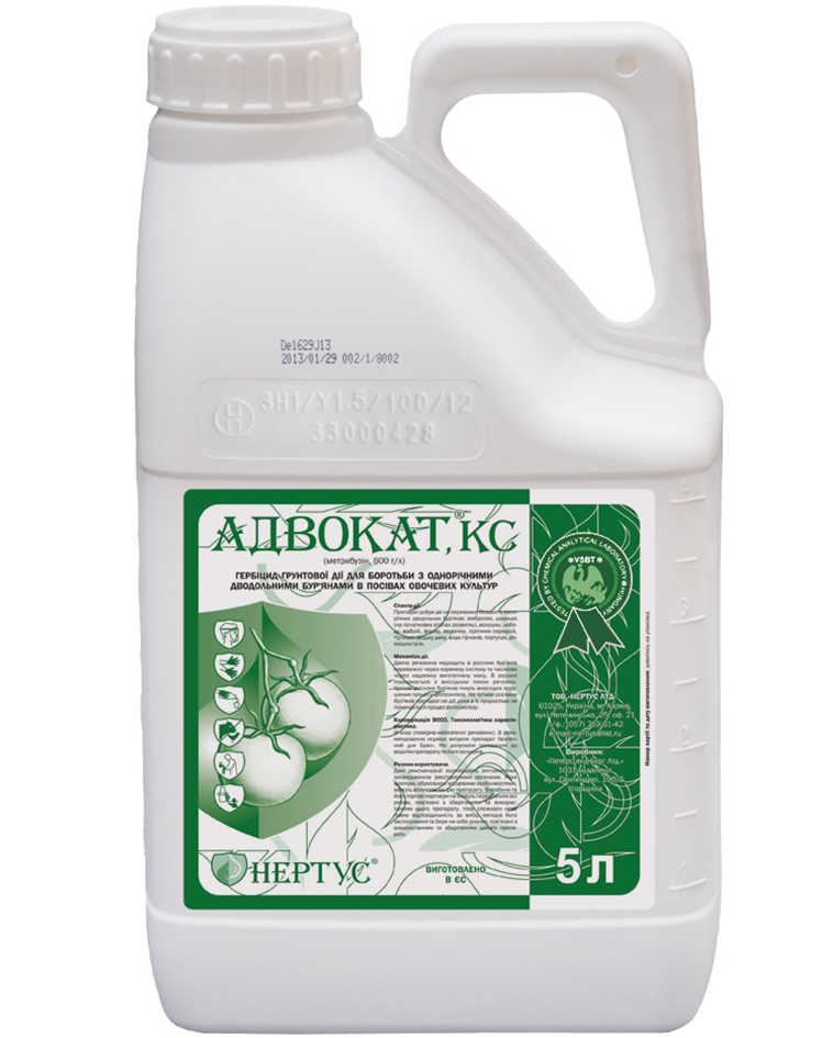 При застосуванні препарату на дію гербіциду істотно впливає тип ґрунту та вміст органічної речовини. Тому максимальні дози препарату вносять на важких, по механічному складу ґрунтах, мінімальні - на легких. На посівах картоплі препарат вносять, як правило, до сходів культури, але можливе післясходове застосування препарату - за висоти рослин до 5 - 10 см з нормою витрати 0,5 л/га. На томатах безрозсадних також можна проводити внесення препарату в два етапи: ■ перший етап - одразу після посіву, до появи сходів культурних рослин з нормою витрати препарату 0,3 л/га; ■ другий етап - у фазу 4 - 6 справжніх листків у культурних рослин з нормою витрати препарату 0,4 - 0,5 л/га. Селективність Не всі сорти культурних рослин (ранньостиглі сорти картоплі, деякі сорти томатів, сої) однаково реагують на дію метрибузину. Тому бажано завчасно уточнювати у компанії виробника насіннєвого матеріалу рівень стійкості того чи іншого сорту до діючої речовини метрибузин. Несприятливі умови для росту та розвитку культурних рослин (знижені температури, посуха, умови надмірного зволоження, приморозки) під час застосування препарату можуть знижувати стійкість культури до дії гербіциду. При застосуванні препарату в період переростання культурних рослин спостерігається зміна кольору листків (колір листків варіює від світло-зеленого до жовтуватого). Такі ознаки проходять впродовж 10-15 днів і, як правило, суттєво не впливають на врожайність культури. Обмеження по сівозміні Розпад препарату в ґрунті, за сприятливих умов відбувається впродовж 1-3 місяців. Швидкість розпаду гербіциду в ґрунті обумовлюється наступними факторами - наявністю доступної вологи, рівнем pH ґрунту (особливо за умов лужної реакції рН>7), механічним складом ґрунту, активністю мікроорганізмів, тощо. Всі ці фактори, як поодинці так і сумісно, можуть вплинути на безпеку наступної культури сівозміни. Тому: ■ На наступний рік на полях, де використовувався даний гербіцид, не рекомендовано висівати цибулю, салат, огірки, буряки та культурні рослини з родини Капустяні /Хрестоцвіті. ■ У разі пересіву поля, на якому було внесено гербіцид АДВОКАТ дозволяється висівати: через 2 місяці - картоплю; через 3 місяці - зернові, зернобобові кукурудза, люцерну, конюшину, соняшник. Ознаки гербіцидної дії Характерна ознака дії препарату - знебарвлення рослин бур'янів. Зазвичай бур'яни знищуються на етапі їх проростання з насіння. При післясходовому застосуванні загибель бур'янів відбувається впродовж 10-20 діб після внесення препарату. Період захисної дії при до сходовому внесенні триває 1-2 місяці, в залежності від погодних умов та запасів насіння бур'янів в ґрунті. Застереження ■ Не рекомендовано проводити внесення препарату безпосередньо перед дощем, поливом чи обробкою ґрунту. ■ Не рекомендовано проводити внесення препарату впродовж 3 днів після погодних умов із зниженими температурами повітря та надмірним зволоженням. ■ Незалежно від норми витрати препарату та методу його внесення, друге внесення даного гербіциду проводять не раніше ніж через 14 днів після першого. ■ Не рекомендовано проводити післясходове внесення препарату на ранньостиглих сортах картоплі без узгодження із компанією-виробником насіннєвого матеріалу. ■ Загортання препарату в ґрунт не рекомендовано. ■ Низькі температури ґрунту та повітр