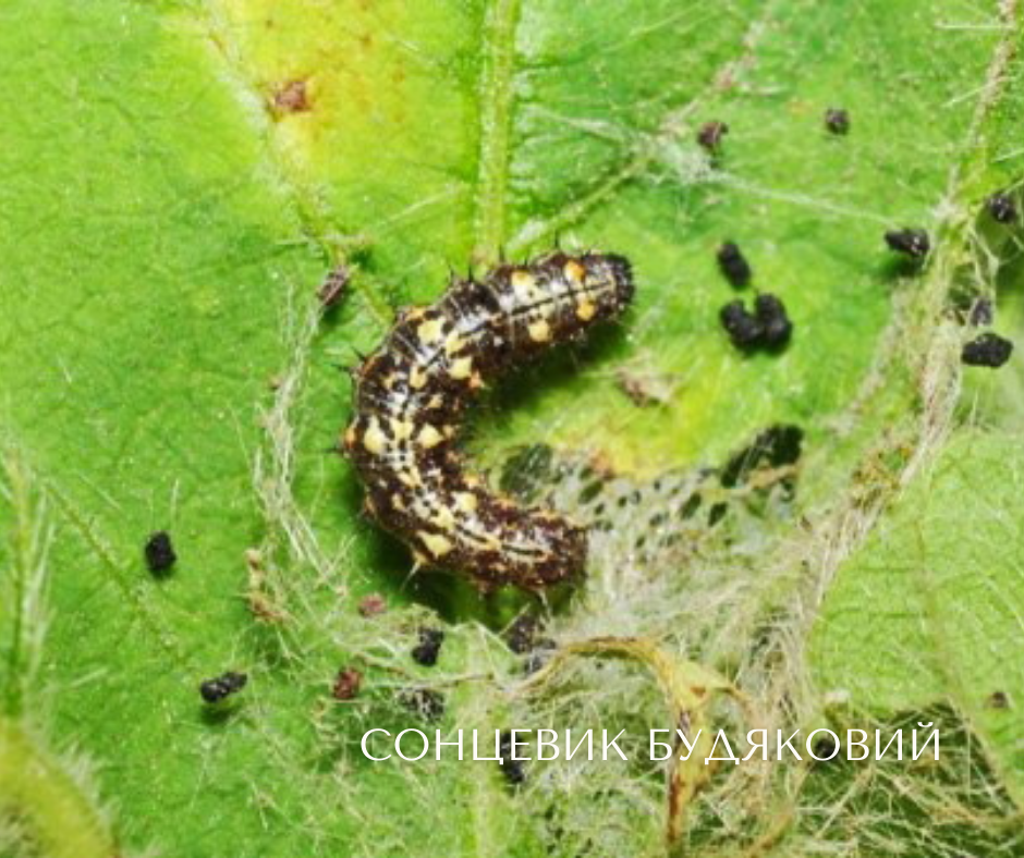 ✅ Сонцевик будяковий (фото 6-9) – метелики живляться нектаром бур’янів, відкладають яйця на листки сої, соняшнику та складноцвітих бур’янів. Гусениці живляться на листках – спочатку під захистом павутинки, пізніше згортають і з’єднують листки. В осередках масового розмноження можуть дуже сильно пошкодити листки сої.