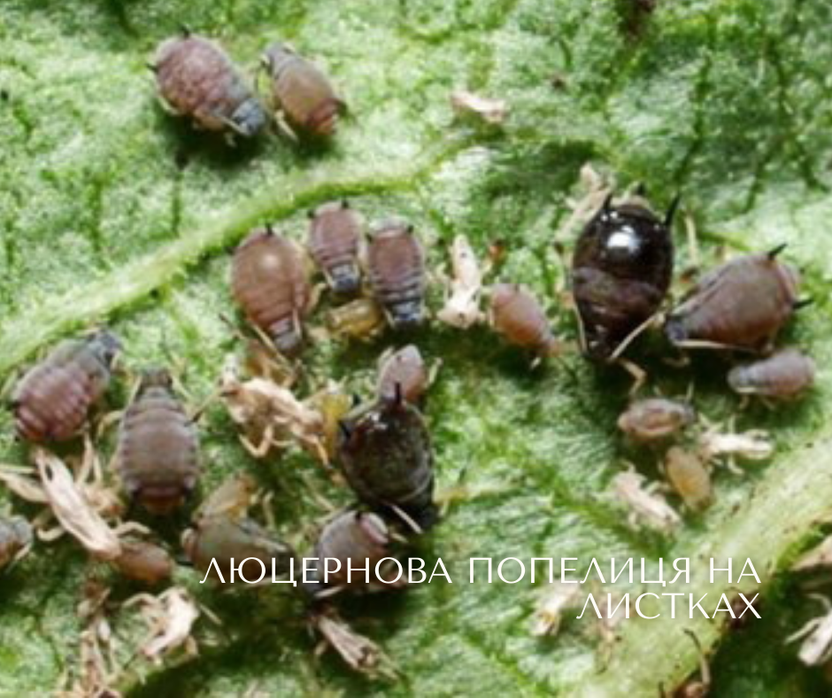 ✅ Люцернова попелиця (фото 5) – наразі заселяє посіви сої, при масовому розмноженні утворює численні колонії на листках.